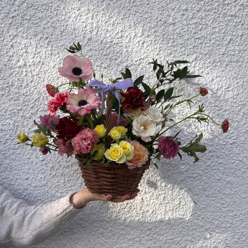 The Blooming Basket! Our flower basket arrangement features uplifting seasonal flowers that are sure to brighten anyone’s day. With our same day flower delivery or collection service, you can rest assured that your flower basket will be ready fresh and on time. Whether you’re celebrating a birthday, anniversary, or just want to send some love, our flower arrangement in a beautiful wicker basket is the perfect choice.