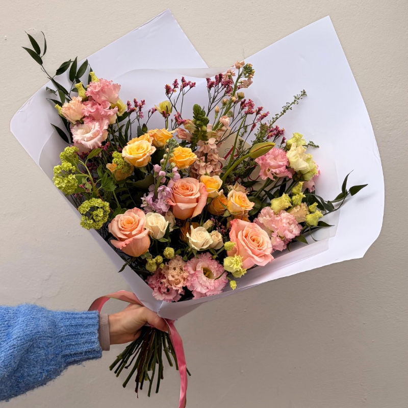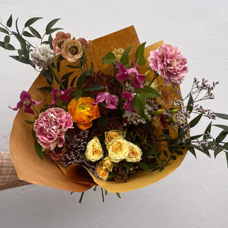 Looking for the perfect bouquet of flowers to brighten up your space at home? This gorgeous selection of seasonal flowers wrapped in eco-friendly Kraft paper is the perfect arrangement to replenish your favourite vase. Whether you’re treating yourself to a beautiful bouquet for your home or sending them as a thoughtful gift to a loved one, our bouquets are sure to put a smile on anyone’s face. And with our same day flower delivery service, you can have your delightful bouquet in hand in no time at all. Order yours today and add a touch of beauty to your day!